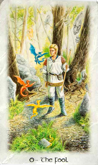 The Fool card from The Celtic Dragon tarot deck, which illustrates a young man trying to decide which path to take as his little dragon friends guide him.