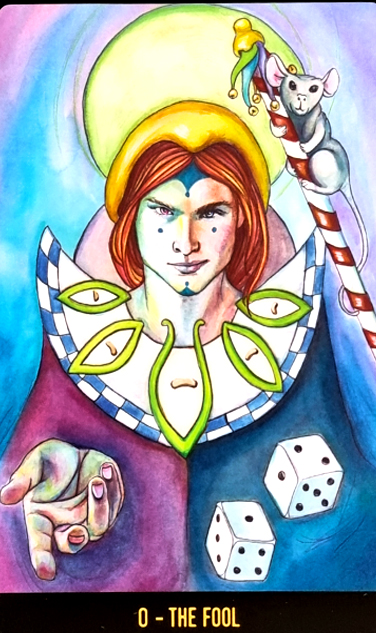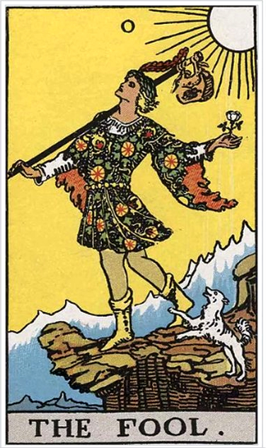 The first card of the deck is called The Fool. Because the numerical value of the card is zero, The Fool can be seen as both the first and last card of the major arcana. It’s fitting if you think of the arcana as a wheel that cycles around back to the beginning after each major adventure.