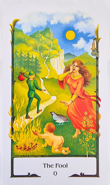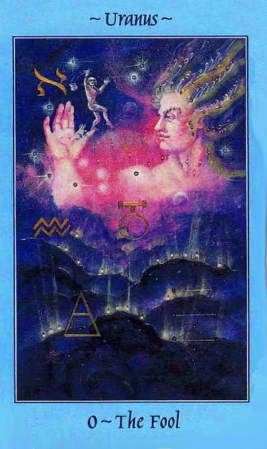 Fool Card from the Celestial Tarot Deck, in which a celestial being drops the fool into the worldly realms to begin his adventure.